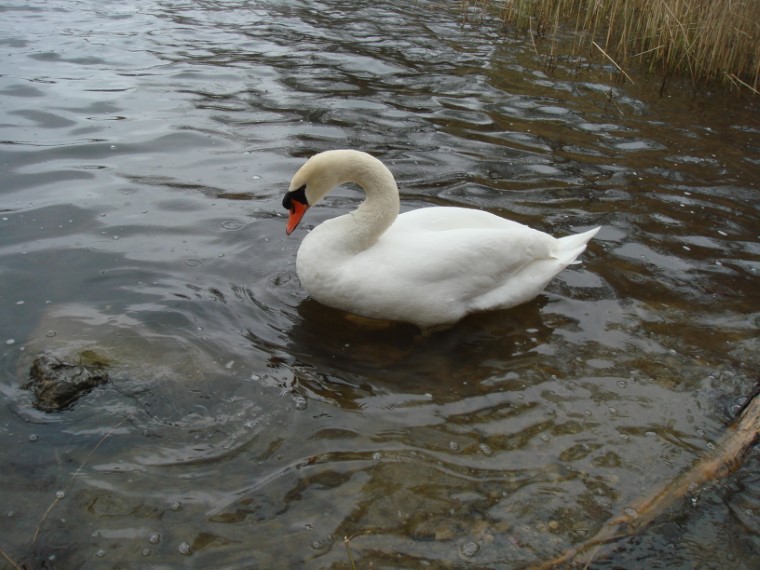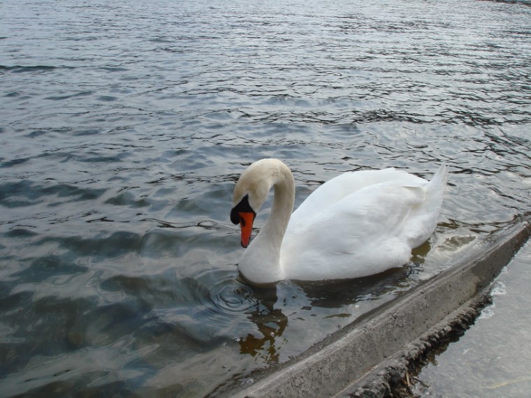 当我走到远离樱花湖畔,来到拍摄柳树和芦苇的湖畔时,我居然再次看见白天鹅了。即使不是同一只,我与白天鹅也可以说这次真是太有缘分了。如果是同一只,那就不是一般的缘分了。白天鹅这会儿依然在相机不远处摆着模特姿势,好像知道我这只是一个傻瓜相机,需要很近的拍摄距离。