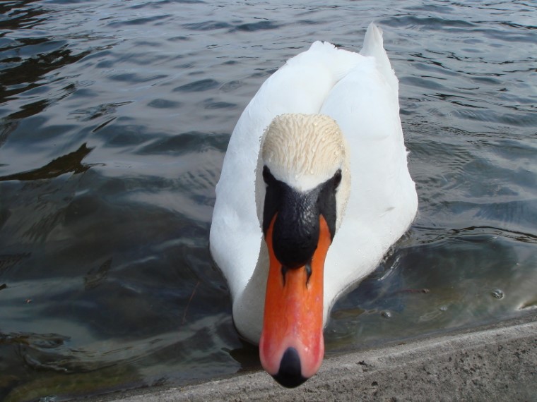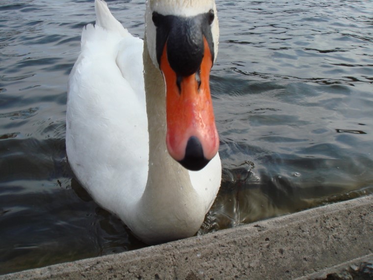 在樱花的湖畔,我见一对情侣正在给一只白天鹅照相。白天鹅一点都不胆怯,反而像一个训练有素的名模,安然地摆着不同的姿势。绝好的机会不可错过。我三步并作两步,也赶紧凑上去“抢拍”。这次,白天鹅根本没有跑远的意思。照相机就在一尺远的地方,白天鹅镇静自若,还缓慢的原地转动着身子,好像有意给你不同的拍摄角度。 在我咔嚓咔嚓拍照的时候,我看到白天鹅向我靠近。我知道白天鹅可能要“亲吻”我的相机了,这是机不可失失不再来。我拿稳相机,连续拍摄。直到我看到一个大嘴出现在取像框里,并感到照相机被震动了一下。在这个过程中,我听到那对情侣在一旁惊呼声不断在增强:”It’s posing for photos. It’s coming close to us. It knows that we are taking pictures.It’s eating your camera.It’s thinking that’s food.” 虽然,可以解释为白天鹅误以为照相机是人们为其准备的食物了,我宁愿理解为:这位白天鹅名模有意亲吻相机,以求摄像者能把这个吻通过照片,送给广大的观众。