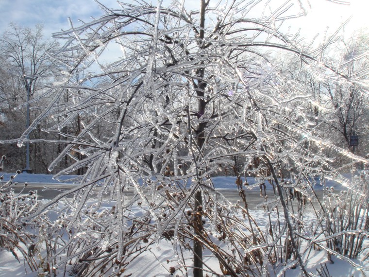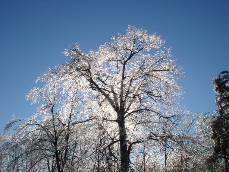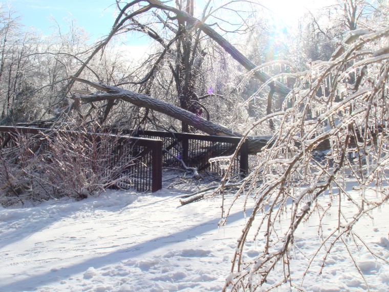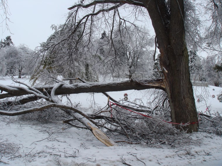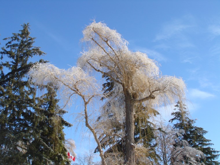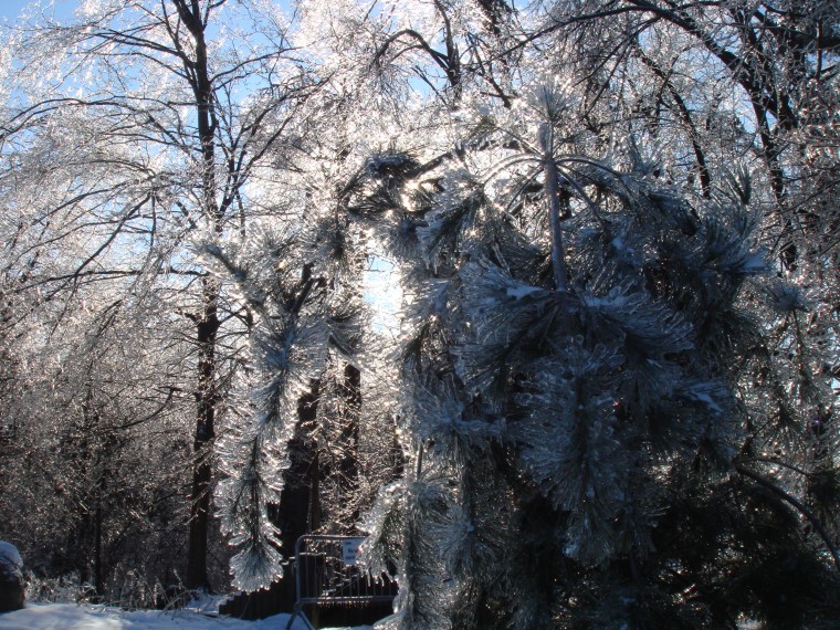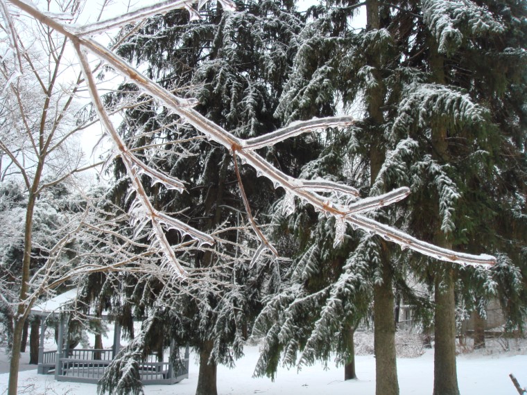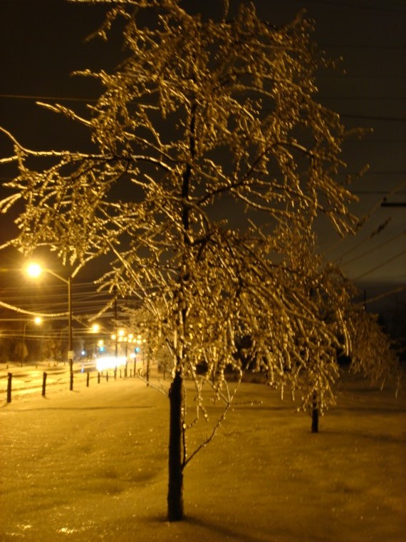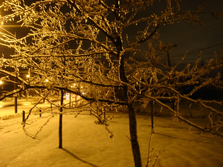 冰暴发生在2013年12月21日夜。那天参加公司的圣诞晚宴,回到家11点左右时,一路上还没有开始结冰的迹象。后来大树就折枝倒地,压断电线了。