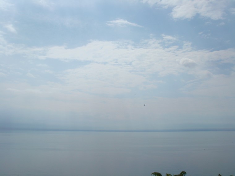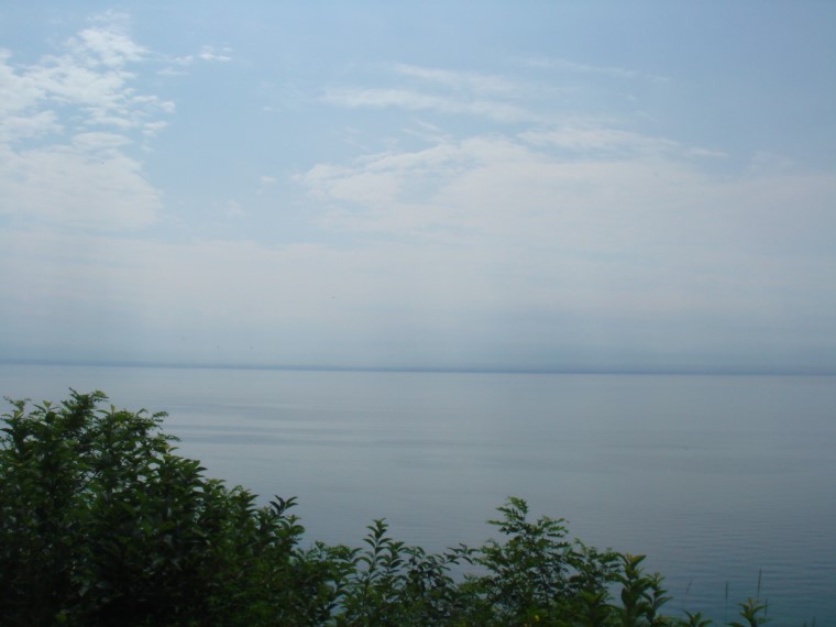 那天太阳光透过云层照在一片烟雾迷茫的湖面上。