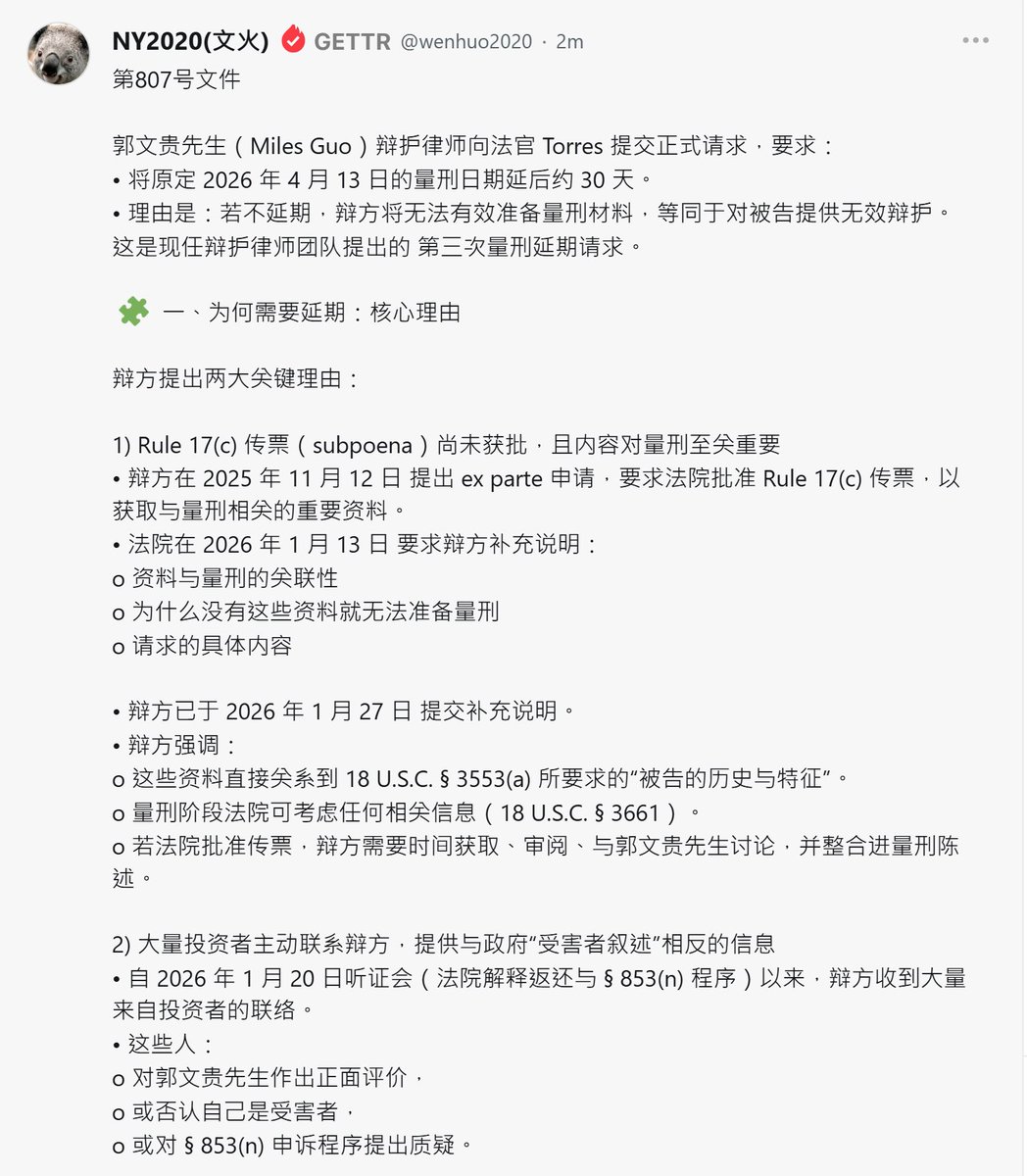 郭文贵再次申请将26年1月20日量刑宣判推迟3个月