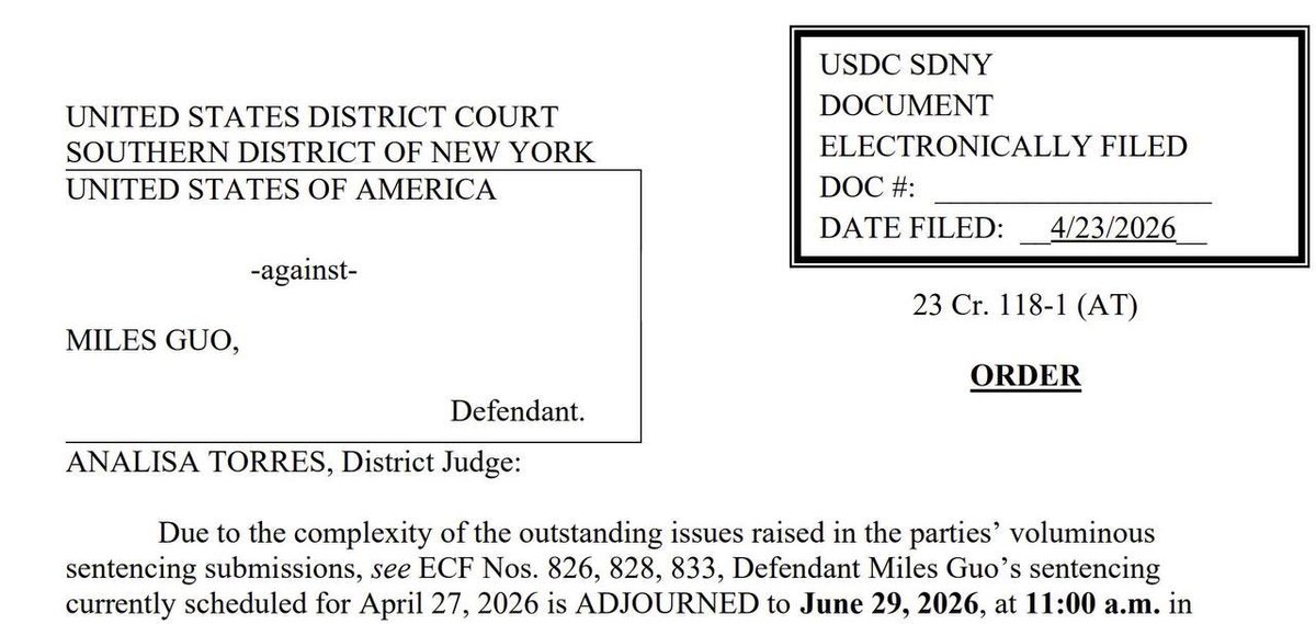 Torris 法官4月23日法庭令:郭文贵量刑开庭延期到2026年6月29日11:00
