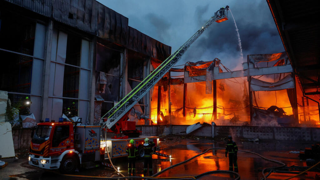 2025年10月25日,在乌克兰基辅,消防员在被俄罗斯夜间导弹袭击击中的食品仓库现场工作。 REUTERS - Valentyn Ogirenko