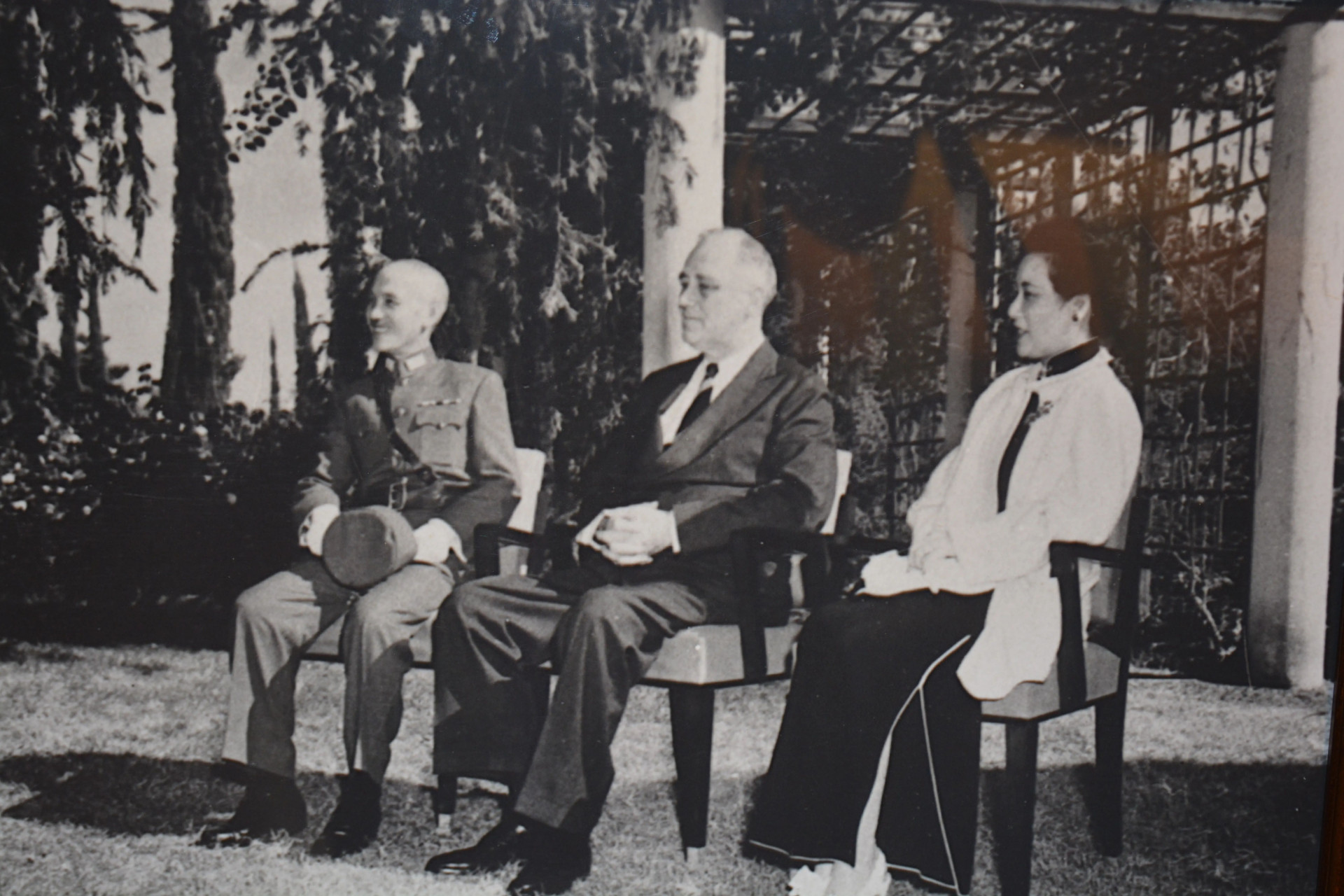 蒋中正夫妇与罗斯福在开罗会议中合影,开罗宣言提到台湾澎湖应归还中华民国。(拍摄自国史馆开罗宣言70周年纪念特展)