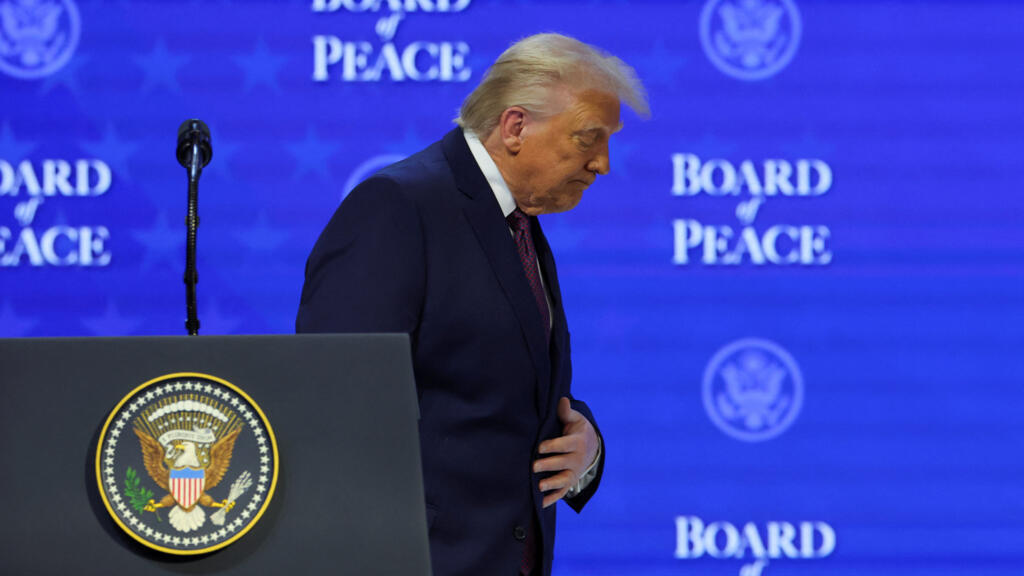 2026 年 1 月 22 日,在瑞士达沃斯举行的第 56 届年度世界经济论坛 (WEF) 上,美国总统唐纳德·特朗普在宣布旨在解决全球冲突的和平委员会倡议章程后离开。 REUTERS - Denis Balibouse