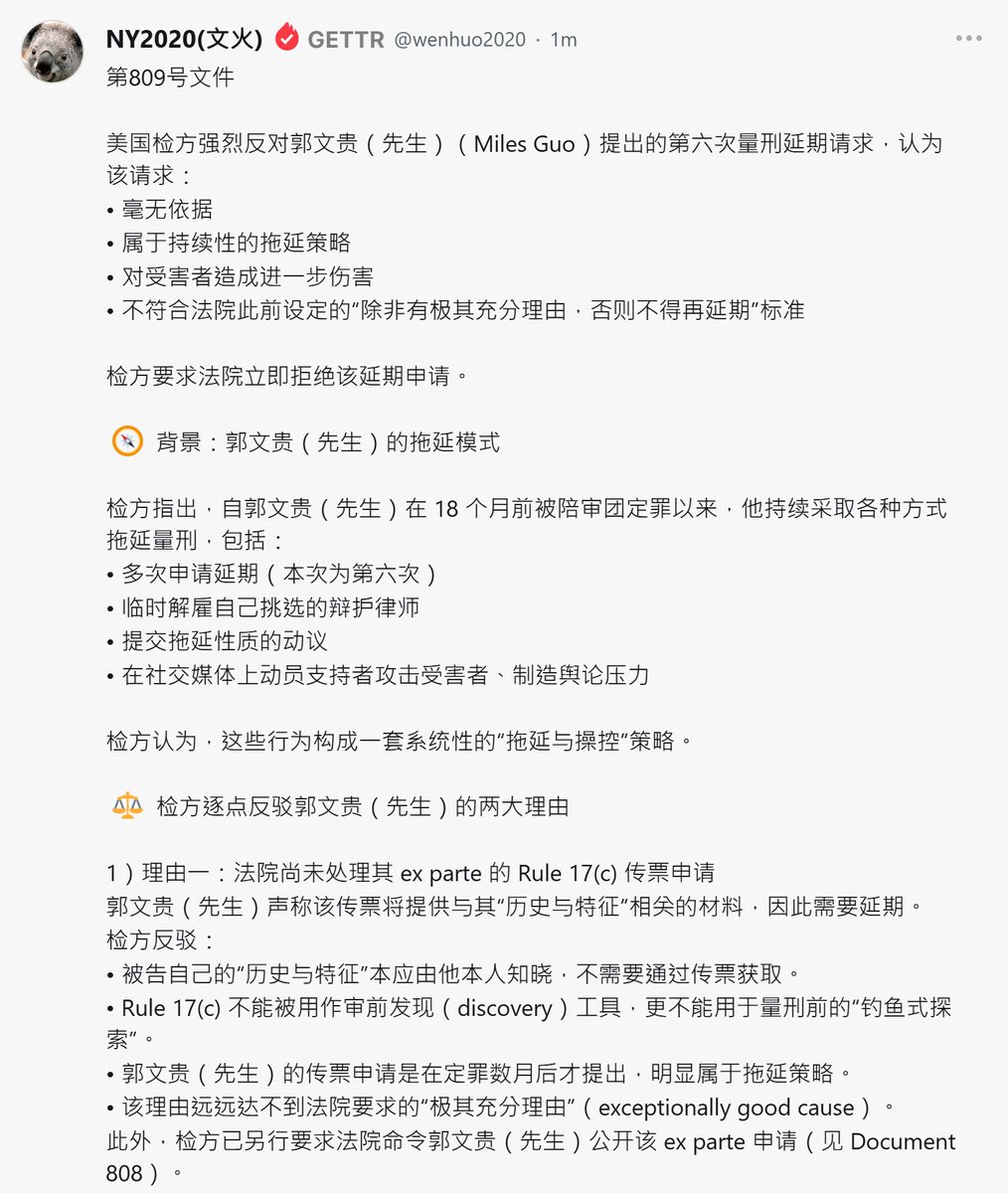 美国检方强烈反对郭文贵(先生)(Miles Guo)提出的第六次量刑延期请求,认为该请求: