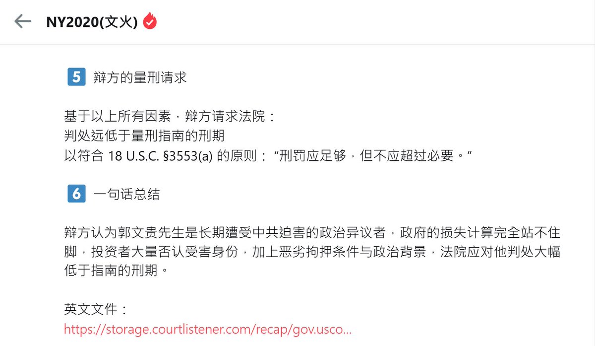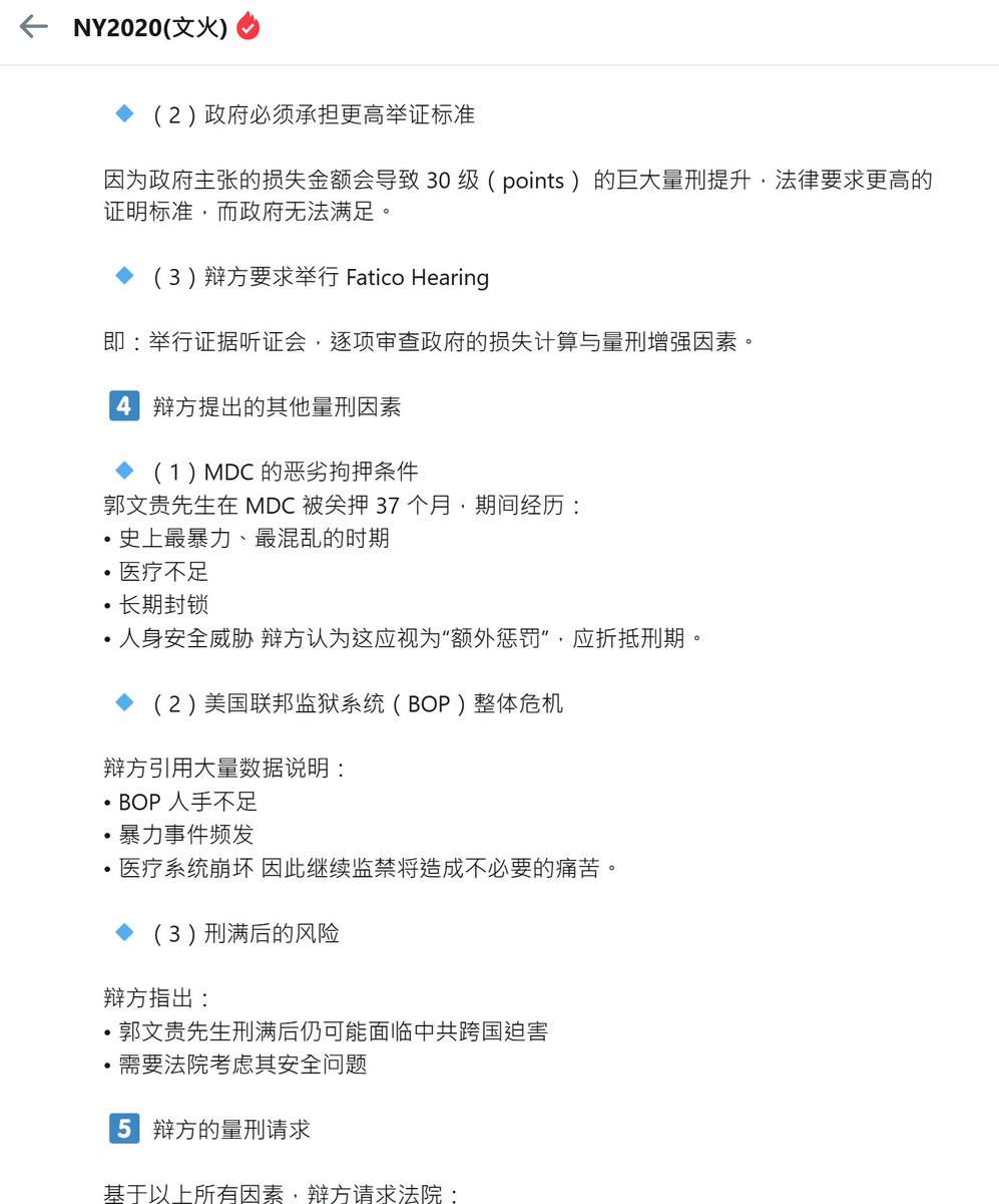 辩方认为郭文贵先生是长期遭受中共迫害的政治异议者,政府的损失计算完全站不住脚,投资者大量否认受害身份,加上恶劣拘押条件与政治背景,法院应对他判处大幅低于指南的刑期