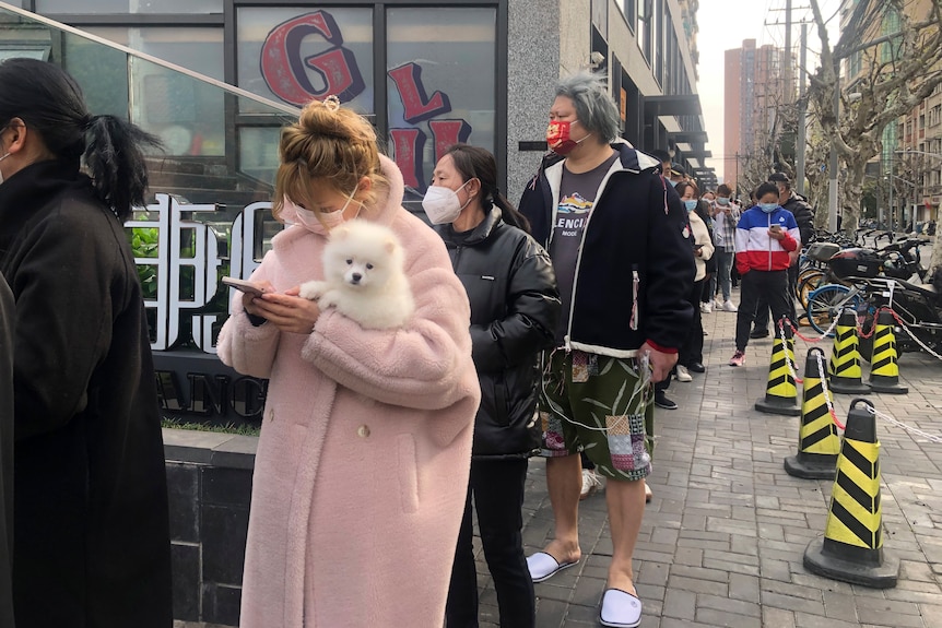 上海一处居民区里排队做核酸的人们。( AP:Cheng Si)