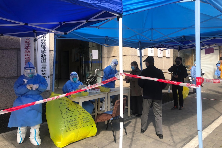 上海疫情蔓延,医护人员正在为居民做核酸检测。( AP:Cheng Si)